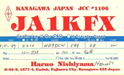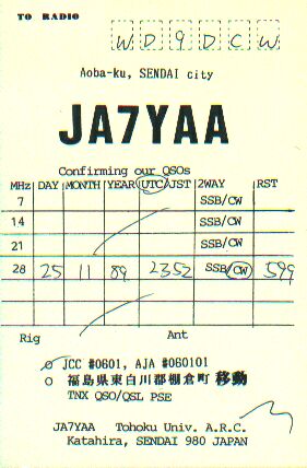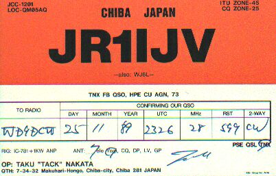 From PAGE 21: 19891028 23:58 EA8ACH " 5933 21.312 " " --:-- CANARY ISLANDS____________________S,R 19891125 10:01 CU2AK 59904 14 7.035 CW 110 : EXCHANGE= REPORT+ITU ZONE_________S,R 19891125 23:10 JA1KFX " 59925 28.038 " " : JAPAN_____________________________S,R 19891125 23:25 JR1IJV " 25 28.032 " " : " _____________________________S,R19891125 23:52 JA7YAA " " 28.045 " " : " _____________________________S,R 19891126 13:06 SM6BJI " 59914 28.026 " 100 : SWEDEN____________________________S,R ![]()