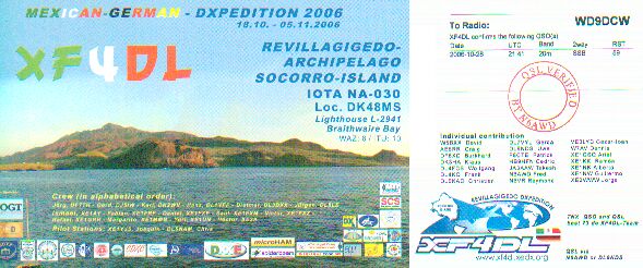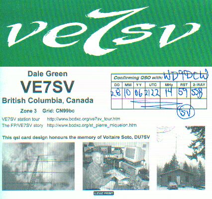 20061028 21:22 VE7SV 5904 59 3 14.247 USB 50W Dale, Surrey,BC,CANADA_S,R 20061028 21:40 XF4DL " 59 6 14.322 " " : SOCORRO Is. (Revillagigedo Island Grp.) MEXICO__S,R 20061028 21:56 IR4X " 5915 14.257 " " : Claudio, Crespellano, ITALY_______S,R 20061029 00:48 VE6AO " 5904 14.258 " " : CALGARY AMTR RADIO ASSNAB. CANADA_S,R