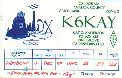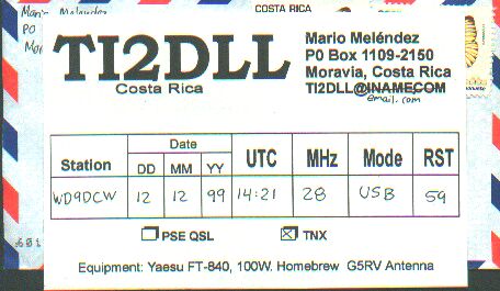 From PAGE 26: 19941203 10:53 K5NA 599IL ENY 1.834 CW 80W 19941203 11:46 W0HW " MN 1.819 " " 19941203 12:52 W0BXR " IA 1.825 " " From PAGE 28: 19991212 14:23 TI2DLL " 027 28.640 USB 50W : COSTA RICA19991212 15:00 N1RWY " 59ME 28.388 " 19991212 15:42 K6KAY " 59CA 28.467 " ![]()