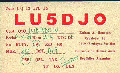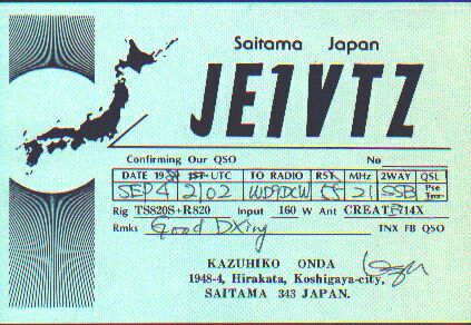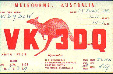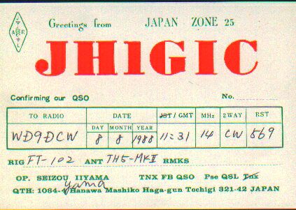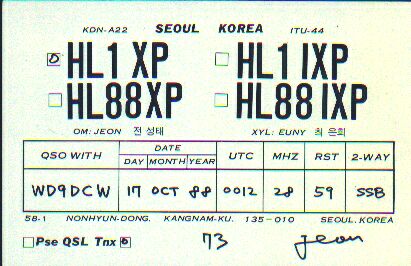 From Page -8: 19880719 12:08 VK3DQ 229 339 10.102 CW 120 12:27 CLIF,VICTORIA,AUSTRALIA___________S,R From Page -9: 19880808 11:30 JH1GIC 439 569 14.065 CW 90W 11:42 YAMA,TOCHIGA,JAPAN________________R 19880904 21:01 JE1VTZ 44- 55- 21.338 USB 85W 21:04 KAZU,NEAR TOKYO,JAPAN_____________S,R 19881009 21:14 LU5DJO 429 549 24.910 CW 110 21:16 RUBEN,NEAR BUENOS AIRES,ARGENTINA_S,R19881017 00:12 HL1XP 43- -- 28.550 USB 110 00:13 Sung Tae,Seoul, Korea_____________R ![]()